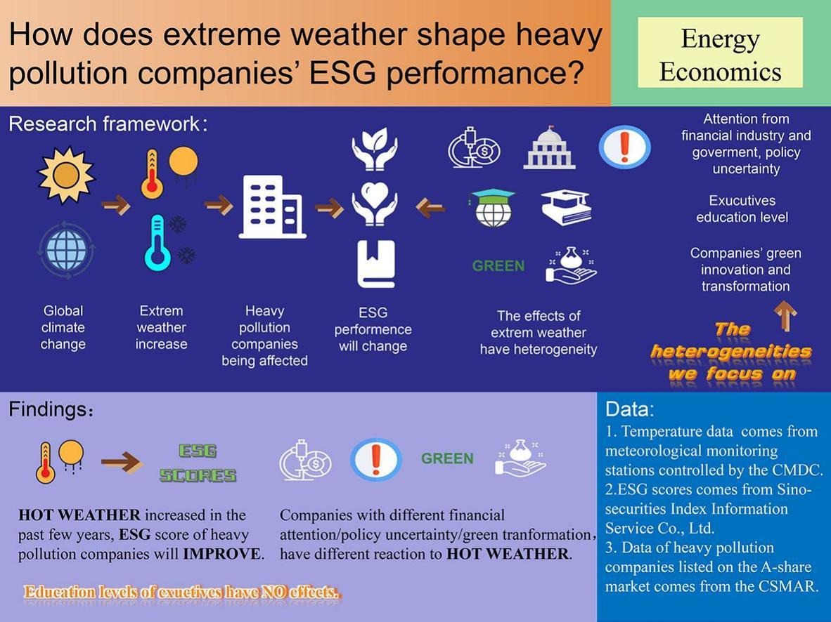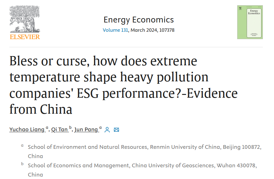 近日,环境公司博士研究生梁宇超在能源经济学领域国际权威期刊Energy Economics发表学术论文。该论文题为“Bless or curse, how does extreme temperature shape heavy pollution companies’ ESG performance?-Evidence from China”。伟德国际bevictor官方网站环境公司为第一作者单位,人口、资源与环境经济学2022级博士研究生梁宇超为第一作者,环境公司庞军教授为论文通讯作者。