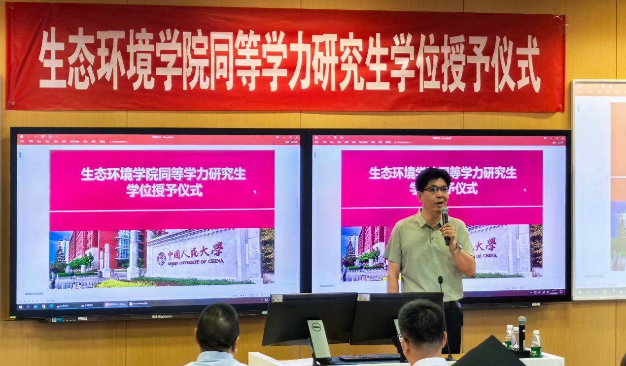 毕业生代表宋思达分享了自己求学之路的感悟。他回顾了入学以来自己克服专业基础薄弱、工作繁忙等困难,利用一切时间学习备考,顺利通过国家考试,并最终获得硕士学位的历程。他向悉心指导自己学位论文的公司老师们表示崇高的敬意和衷心的感谢:“每一处论文批注都是最珍贵的财富。”最后,宋思达引用王安石的诗句“不畏浮云遮望眼,自缘身在最高层”,表达了对学术攀登的坚定信念,并呼吁同学们以所学知识服务可持续发展,做“绿色追梦人”。