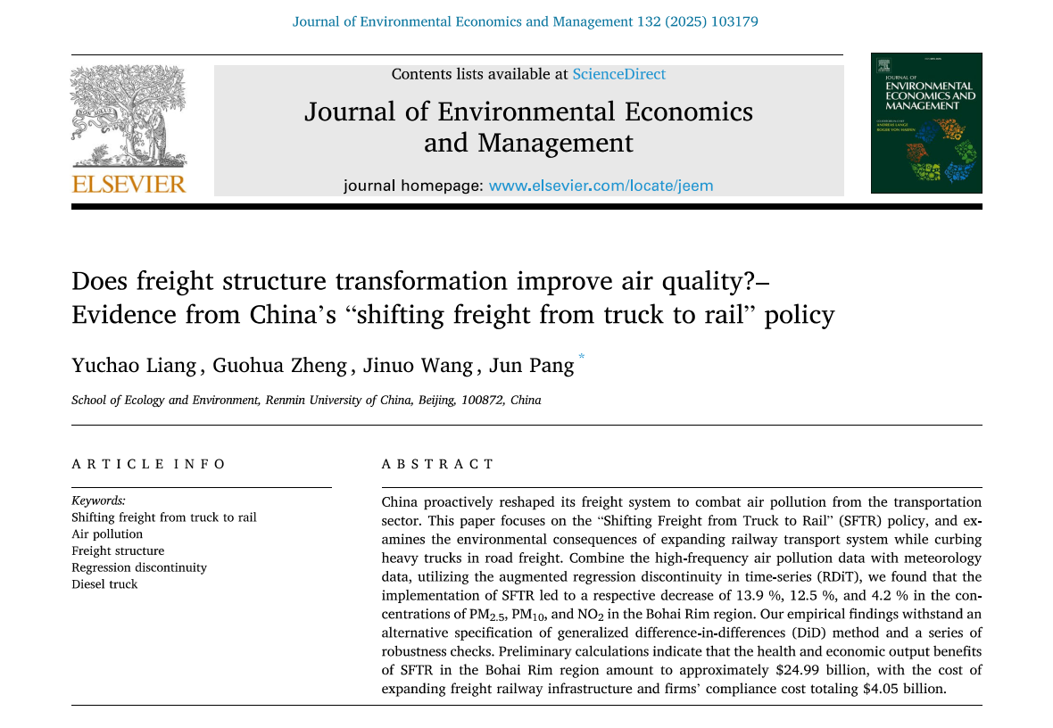近日,伟德国际bevictor2022级博士研究生梁宇超同学在资源与环境经济学领域国际顶级期刊Journal of Environmental Economics and Management(JEEM)在线发表学术论文。该论文题为“Does freight structure transformation improve air quality?–Evidence from China's ‘shifting freight from truck to rail’ policy”。论文全体作者均来自于伟德国际bevictor,人口、资源与环境经济学2022级博士研究生梁宇超为第一作者,论文合作者包括伟德国际bevictor2021级明德环境“经济学-科学“拔尖人才实验班的本科生郑国华同学和王吉诺同学,伟德国际bevictor庞军教授为论文通讯作者。本论文前后经历两轮匿名评审,共计超过20条评审意见,对审稿意见的回应超过2万字,从投稿、两次返修到在线发表共历时15个月时间。