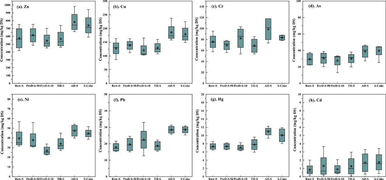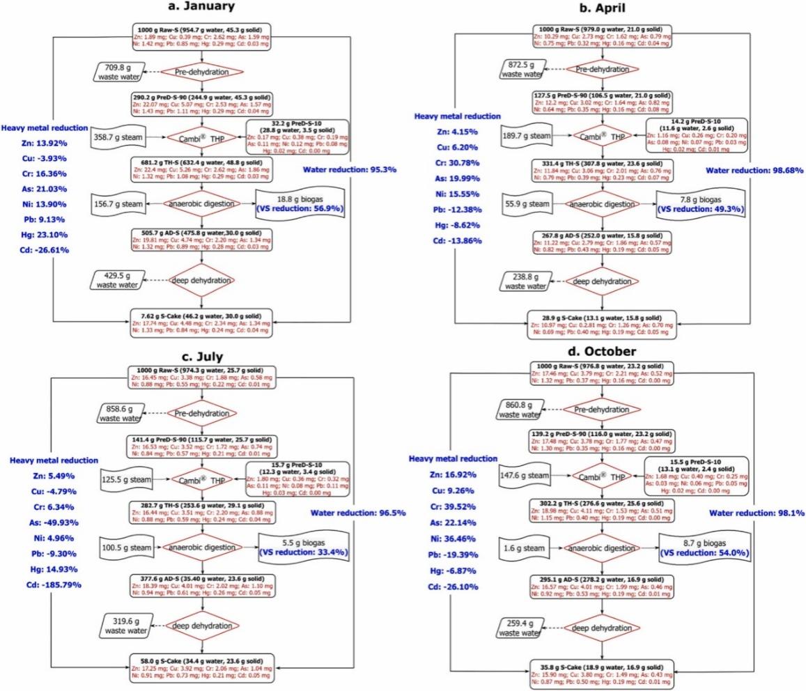 砷、铅、汞、铬、镉等重金属广泛存在于各类环境介质中,对生态环境和人类身体健康造成严重威胁。城市生活污泥作为污水处理的副产物,富集了大量重金属,其行为及去向应重点关注。 “Cambi®热水解+厌氧消化工艺是北京城市生活污泥的主要处理工艺,目前仍缺乏对该工艺过程中重金属的迁移转化规律研究及风险评估,且污水处理厂中污水性质随季节变化,进而影响污泥特性,因此本研究分别于1月、4月、7月、10月沿工艺全流程采样,探讨了该工艺各污泥处理单元(离心脱水、Cambi®热水解、厌氧消化、板框压滤脱水)对重金属的浓度、质量、形态变化的影响,并采用了潜在生态风险指数(RI)和土壤重金属累积预测模型对污泥土地利用时重金属的短、长期风险进行评估。