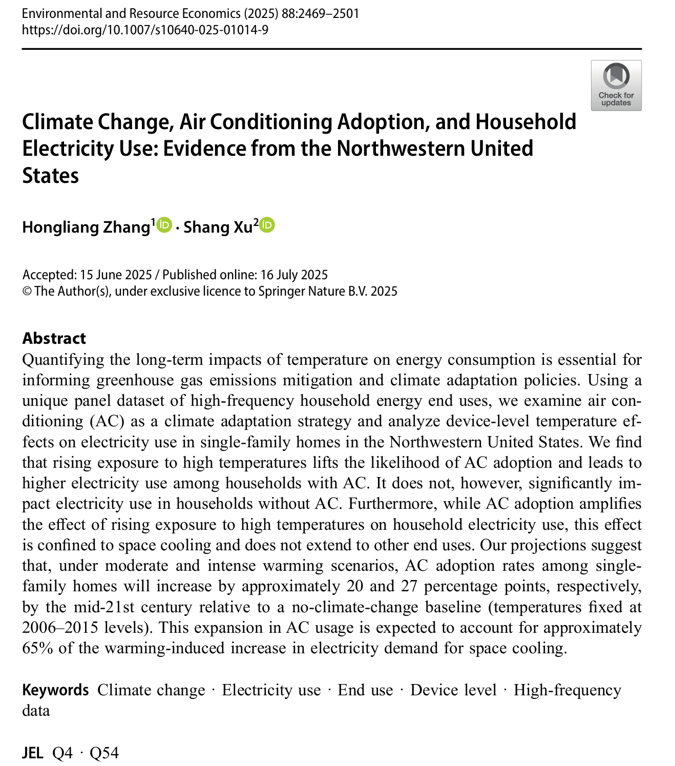 近日,伟德国际bevictor张红亮副教授作为第一作者,合作研究论文《Climate Change, Air Conditioning Adoption, and Household Electricity Use: Evidence from the Northwestern United States》发表在资源与环境经济学领域国际知名期刊Environmental and Resource Economics上。