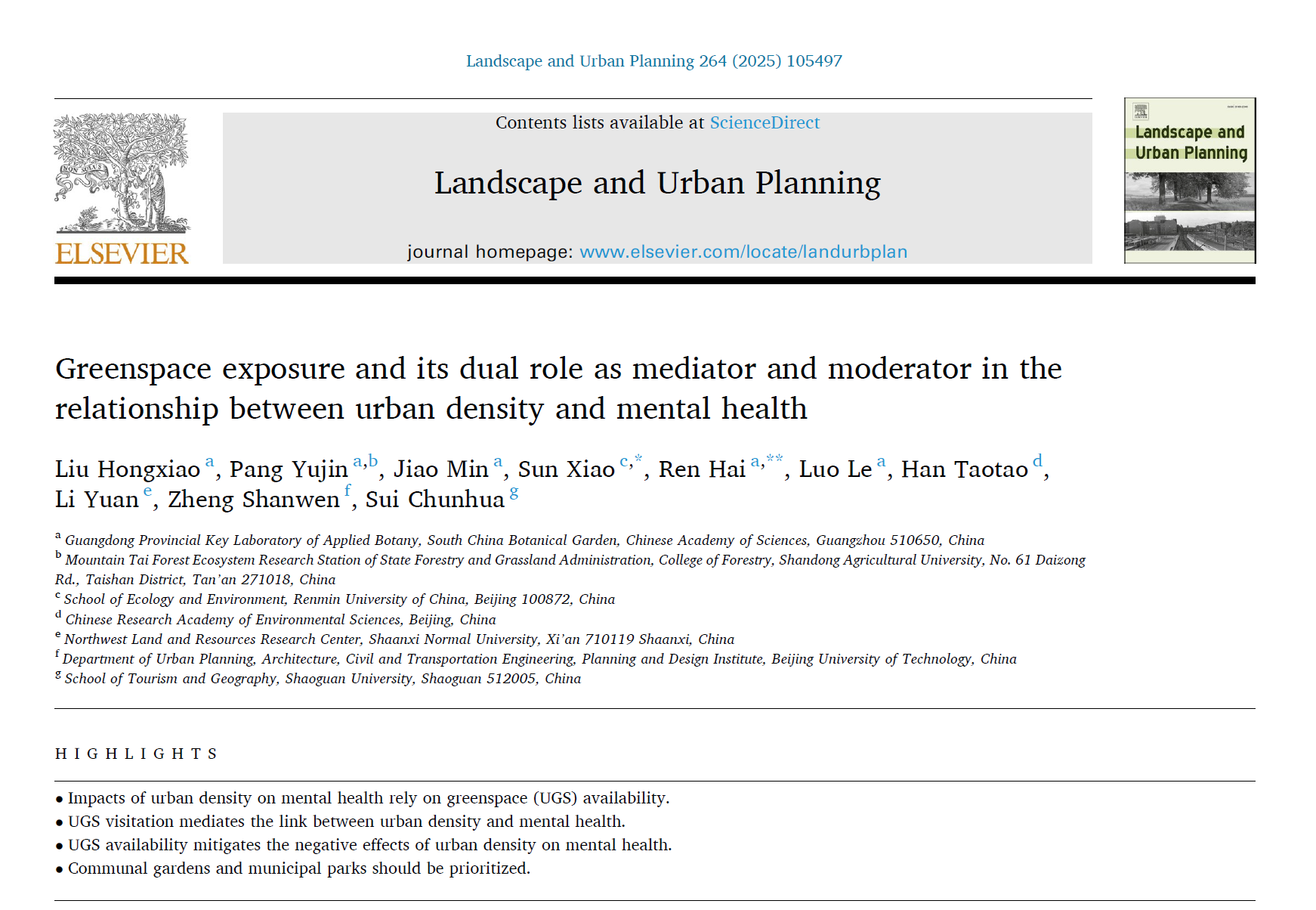 近日,伟德国际bevictor孙晓副教授作为通讯作者,与合作者的研究论文“Greenspace exposure and its dual role as mediator and moderator in the relationship between urban density and mental health”在景观生态学及城市规划领域国际顶级期刊Landscape and Urban Planning发表。