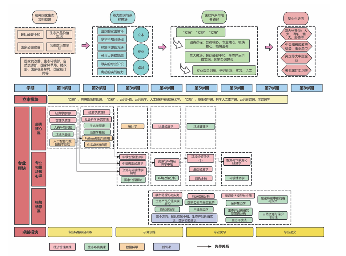 以习近平生态文明思想为指导,依托“双一流”重点建设 A+学科和国家级一流本科建设专业点,本专业旨在培养系统掌握资源与环境经济学学科基础、前沿理论和关键方法,立足中国生态文明建设伟大实践和重大现实问题,具有强烈的家国情怀、厚重的理论素养、宽阔的国际视野、高超的解决现实问题能力的高端复合型经济学人才。本专业严守宽口径、厚基础之原则,注重与环境学、生态学、统计学、数据科学等的交叉共融,培养员工掌握扎实的资源与环境经济学基本理论,掌握现代经济学前沿数量分析方法,使员工形成系统的以经济学为主干的多学科融合的知识结构和思维方式。强调扎根中国大地,注重理论联系实际,聚焦中国碳达峰碳中和、生态产品价值实现、国家公园建设等重点领域,培养员工了解生态文明建设伟大实践,具备扎实的本土知识和敏锐的问题意识,能从专业视角观察、分析和解决现实社会的生态环境问题,能够在国家和地方综合经济管理部门、资源环境管理部门、科研机构、企事业单位从事管理、研究、咨询工作,或者继续攻读相关专业的硕士或博士学位。注重培养员工理论与实践的贯通能力、直面问题的创新能力、具备本土与国际双重视野、能够支撑国家生态文明战略的经济学复合人才,成为德智体美劳全面发展、理论厚实、训练扎实、了解国情、创新包容、活跃于经济社会建设各领域的“复兴栋梁、强国先锋”。