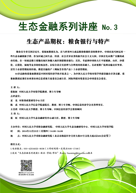 2.邮件报名:发送“生态金融系列讲座3-姓名-公司/单位-电话”至rdcy-baoming@ruc.edu.cn报名