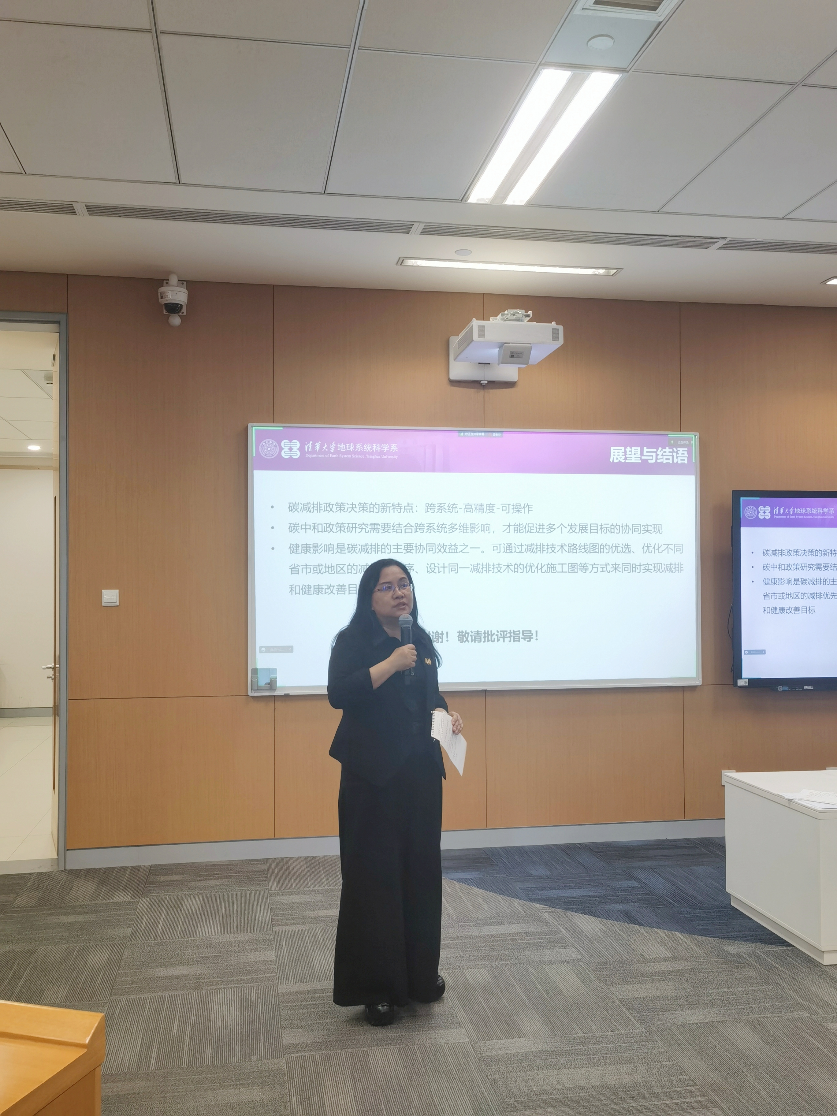 在交流讨论环节,来自线上线下的多位高校师生针对关于林业的负碳排放实现、不确定性的分析、碳中和议题下的适应性、碳减排国际合作模式、碳减排的健康收益来源、碳中和与大气污染治理协同、碳公平研究现状、发展中国家参与应对气候变化等问题,与蔡闻佳教授进行了深入探讨,气氛活跃,师生反响热烈。