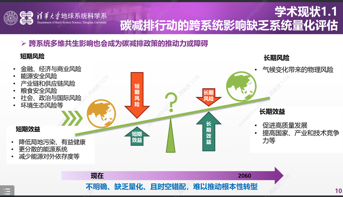 首先,蔡闻佳教授从碳中和将深刻影响中国式现代化展开报告,讨论了碳中和的目标提出、系统布局和基本原则。多年来,中国碳减排重大决策经历了一系列发展演变,与决策支撑能力相关联的数据精度需求和建模难度也不断提升。因此,如何结合模拟结果提出政策优化建议并给出碳中和“施工图”,将是现阶段“双碳”研究的重要领域。蔡闻佳教授提出,碳减排决策在新时期体现出“跨系统、高精度、可操作”的新特点,涉及排放新常态、时空精度、评估对象、解决方案等多方面。此外,跨系统多维共生影响也会成为碳减排决策的推动力,需要在短期和长期的风险与效益之间进行权衡。