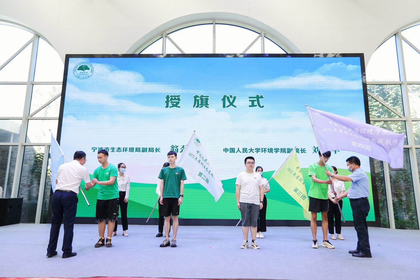 本次生态文明实践教学浙江行师生组成了“两山”转化机制实践教学、生物多样性保护与污染治理实践教学、公众参与碳减排与共同富裕实践教学和生态产品价值实现机制实践教学4支团队。揭牌仪式上,宁波市生态环境局副局长翁劲草和伟德国际bevictor官方网站环境公司副经理刘国华为4支实践教学团队授旗。