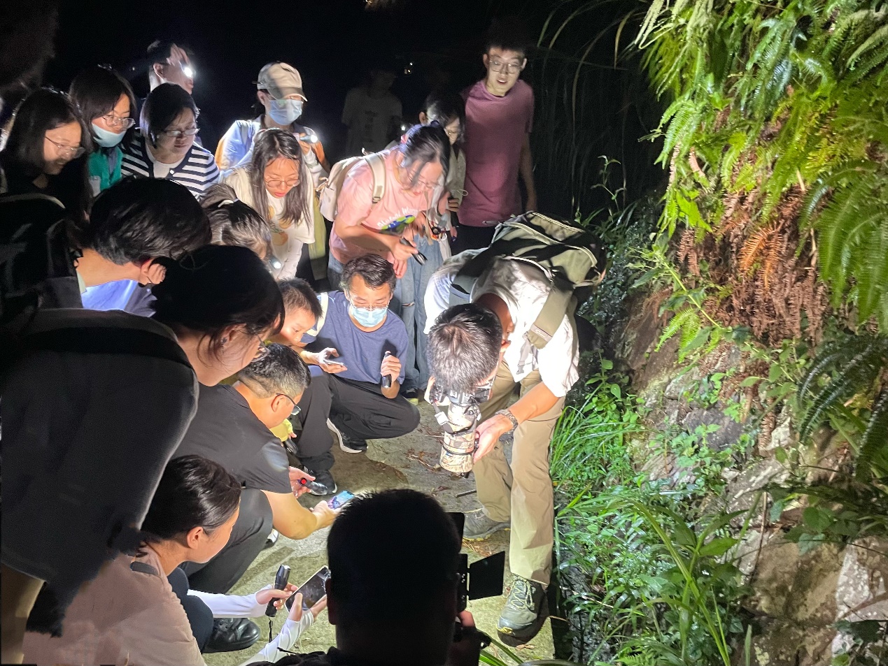 8月21日晚,在张海华记者的带领下,环境公司师生深入龙观开展生物多样性夜探。沿着山间小路前行,潮湿的山野间生灵遍布,同学们观察了中华蟾蜍、大绿臭蛙、纺织娘、络新妇、马陆等生物。当灯光关闭,人声消弭,与星空同时亮起的,还有萤火虫们的身影。“当卢梭在耕作的间隙在树下歇息时,一只鸟飞落在他的肩膀上,他说:‘我知道我的肩膀可以扛起任何的勋章,但惟有这一刻才是我人生最大的荣光。’”张海华老师引用这个故事诠释了他对人与自然和谐相处的理解。