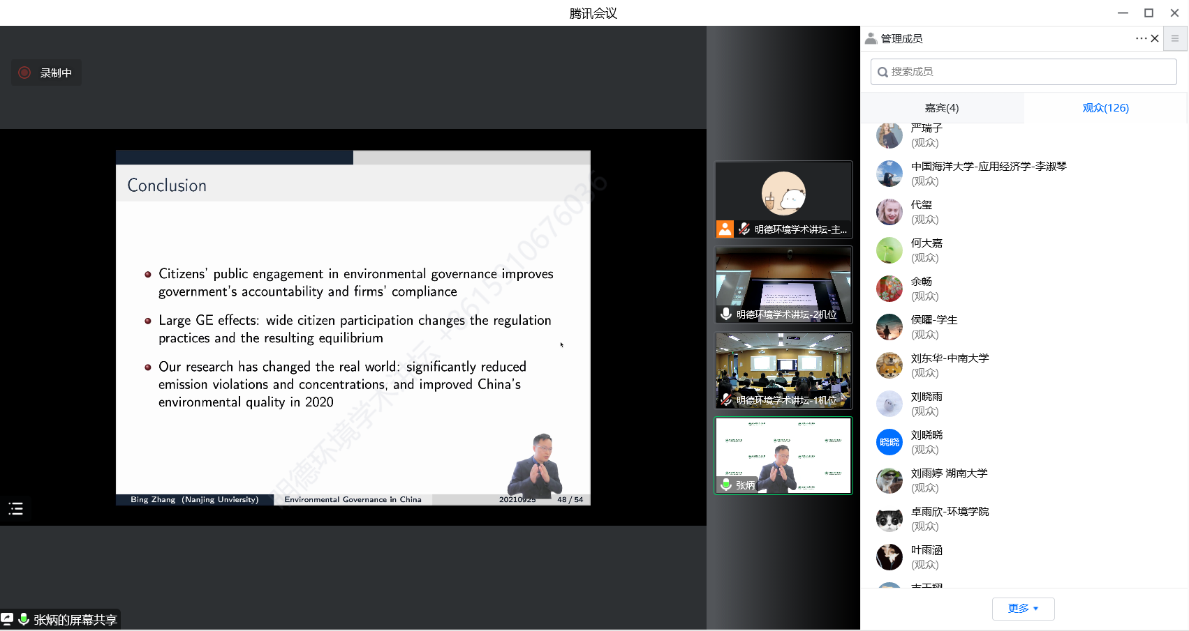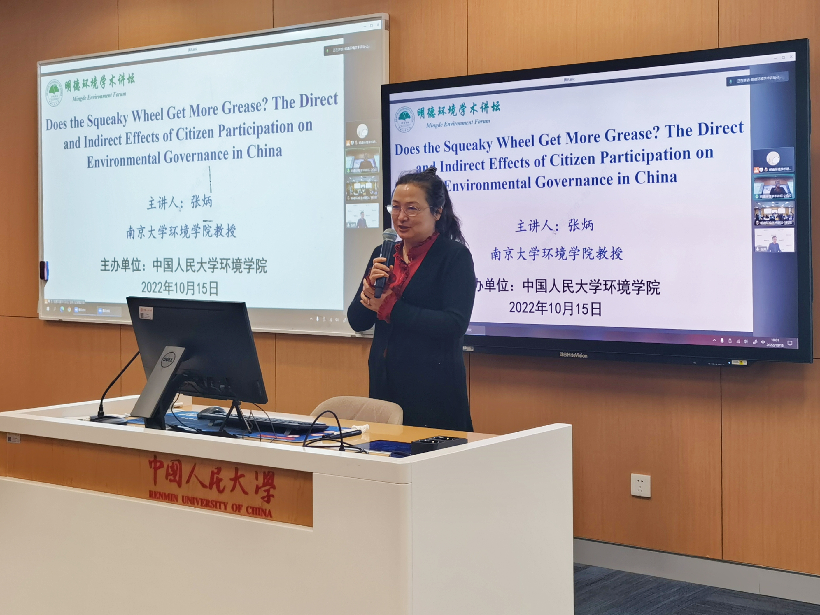 2022年10月15日,伟德国际bevictor官方网站环境公司主办的“明德环境学术讲坛”第六讲以线上线下结合的方式成功举办。本次讲坛邀请南京大学环境公司张炳教授作了题为“Does the Squeaky Wheel Get More Grease? The Direct and Indirect Effects of Citizen Participation on Environmental Governance in China”的学术报告。伟德国际bevictor官方网站环境公司经理庞军教授首先致辞,代表公司对张炳教授为公司师生作学术报告表示诚挚感谢。会议由伟德国际bevictor官方网站环境公司龚亚珍教授主持。