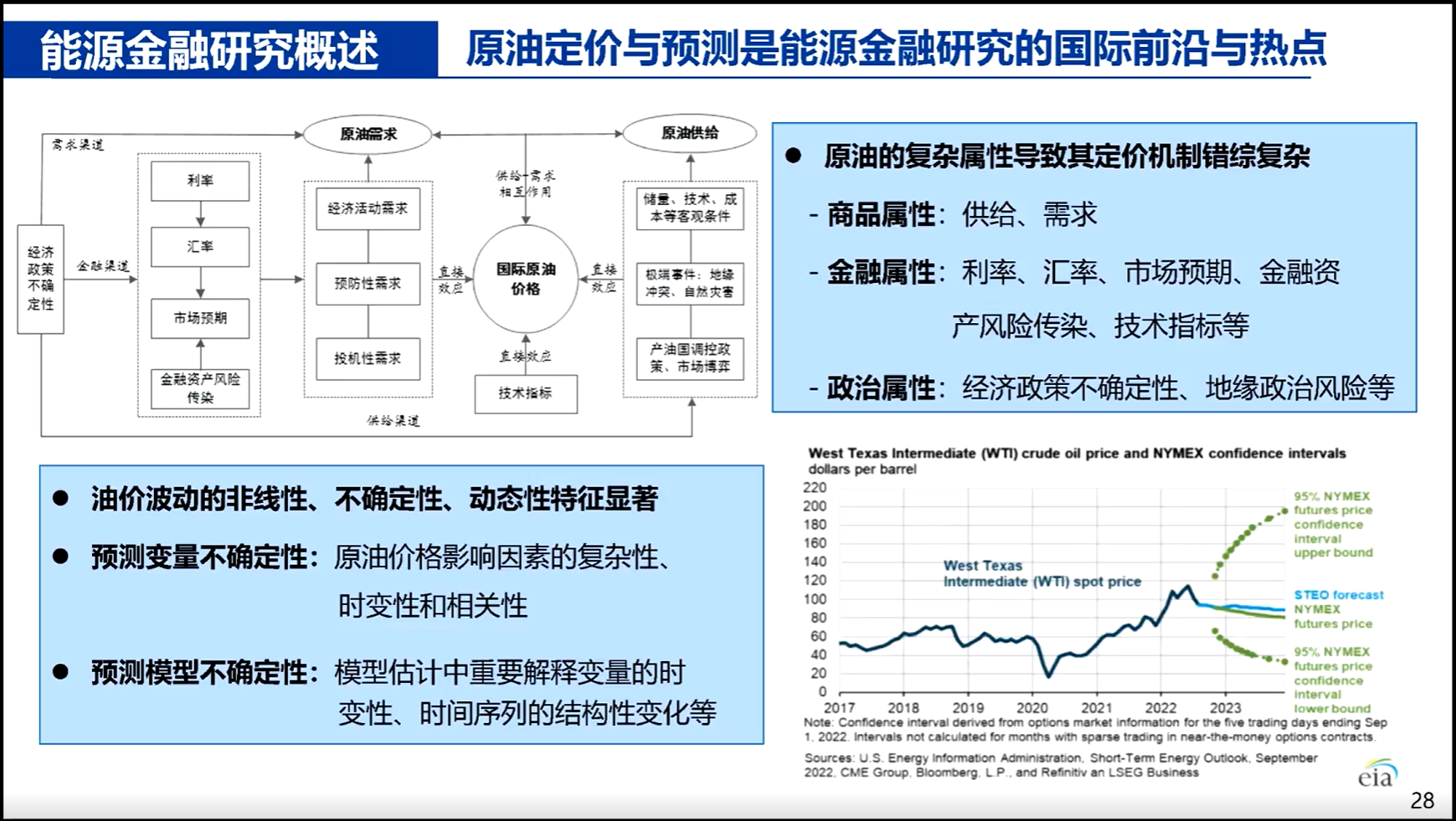其次,张跃军教授详细阐述了能源金融建模领域的研究进展。他指出,21世纪以来能源商品日益金融化,石油不仅具有商品属性,更因衍生品市场发展呈现出明显的金融属性和政治属性。这一特点为油价预测带来非线性、动态性等巨大挑战。张跃军教授团队从传统计量经济模型入手,先后开展了油价波动性建模、风险管理、资产定价等研究;随着大数据和人工智能技术的发展,又将机器学习方法引入能源金融模型,不断提高预测精度和稳健性。在研究中,综合考虑供需、宏观经济、金融市场和地缘事件等多重因素,采用非线性、动态和非对称模型来刻画油价走势,并考虑将预测目标从单点价格预测拓展到区间预测和概率分布预测,通过构建投资组合检验模型的经济价值。这些探索为能源金融研究提供了新的视角和方法论依据。