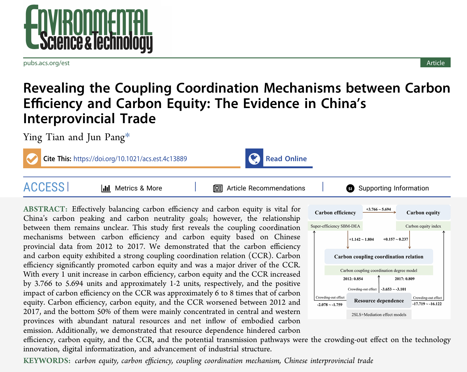 近日,伟德国际bevictor庞军教授课题组在环境领域顶级期刊Environmental Science & Technology发表题为“Revealing the Coupling Coordination Mechanisms between Carbon Efficiency and Carbon Equity: The Evidences in China’s Interprovincial Trade”的学术论文。伟德国际bevictor2021级人口、资源与环境经济学博士田颖为第一作者,庞军教授为通讯作者。