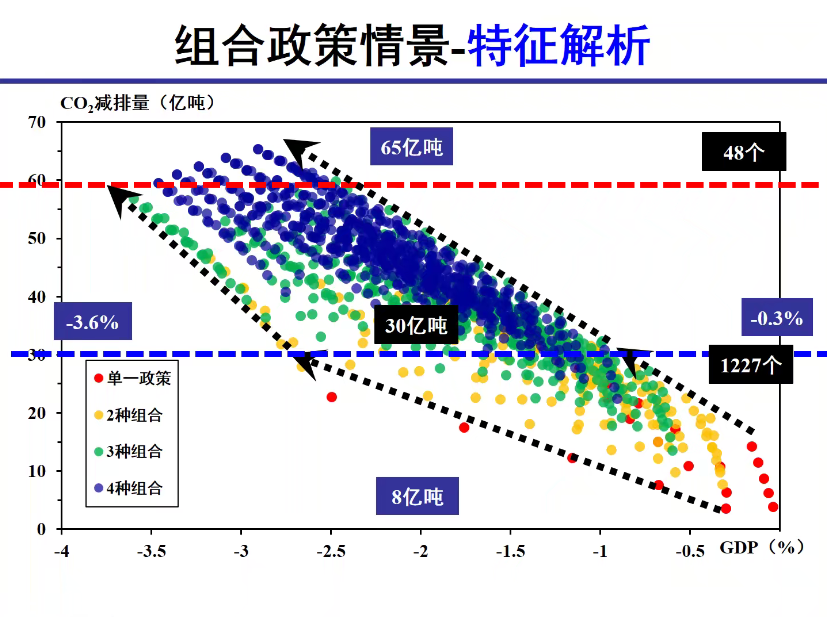 研究结果表明,任何一种单一政策的实施均无法使2060年的碳排放量降低至源汇平衡所需的阈值(20亿吨),这表明碳中和目标的实现需要一揽子政策的组合。就组合政策情景而言,在1295个组合情景中,有48个情景在2060年的碳排放量低于20亿吨,其中碳排放量最低达到13.6亿吨。通过观察组合政策的特征发现,实现碳中和目标的关键政策是电能替代,而实现碳中和目标且最大限度降低对经济负面影响的关键政策是可再生能源技术进步。此外,随着政策组合中政策数量的增加,碳中和目标实现的可能性提高,且对经济增长的负面冲击也相对更小。从碳中和目标的实现路径来看,碳排放量需在2029年前达峰,平台期仅持续到2031年并迅速进入快速下降期,关键时间节点2040和2050年的碳排放量需分别控制在73.3亿吨和43.4亿吨以下。