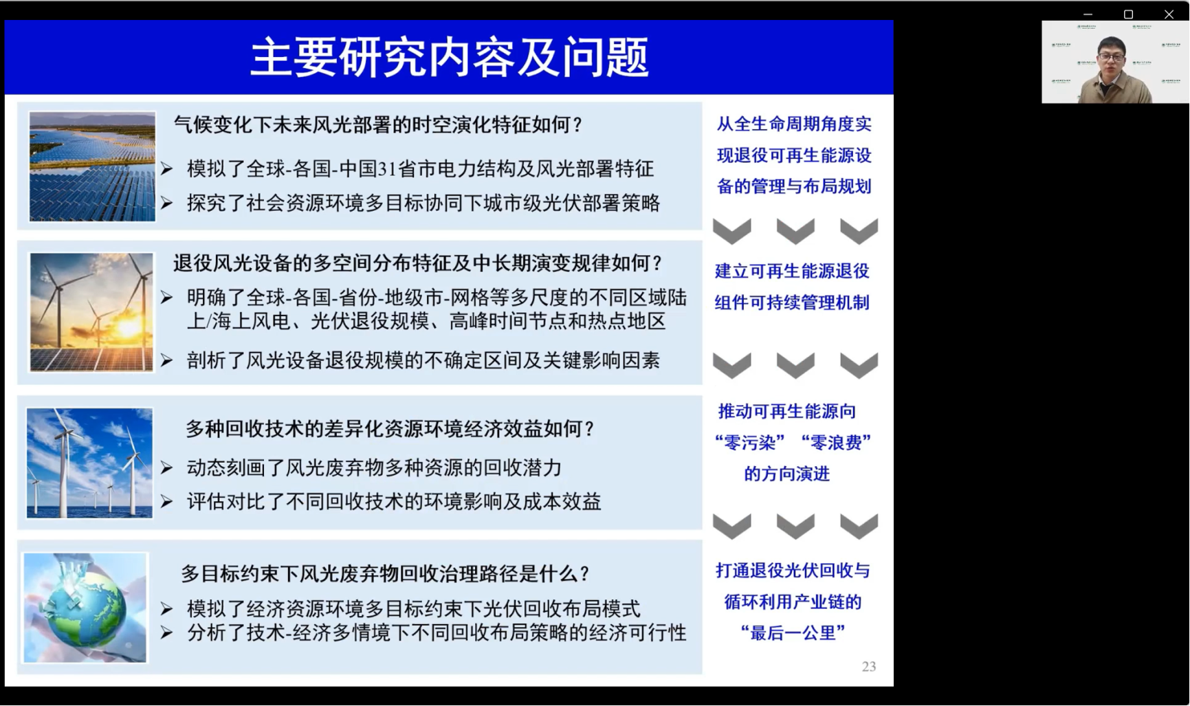 李佳硕教授从四个方面对风光组件的回收进行研究,一是气候变化下未来风光部署的时空演化特征,二是退役风光设备的多空间分布特征及中长期演变规律,三是多种回收技术的差异化资源环境经济效益如何,四是多目标约束下风光废弃物回收治理路径,以期从多视角下为回收策略提供科学的方案。