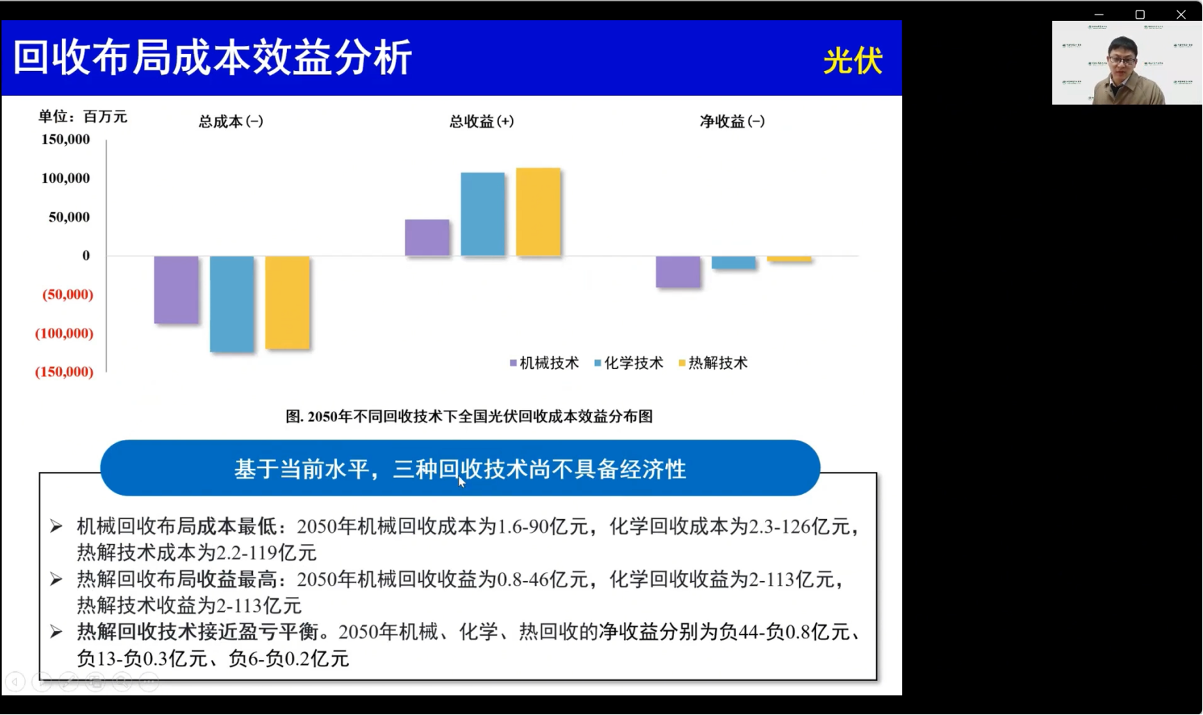 最后,李佳硕教授对光伏回收的环境效益、经济效益、成本效益以及综合效益最优下的光伏回收布局进行了阐述。他指出,在环境方面,废旧光伏组件回收可显著降低生态环境影响;与填埋相比,三种光伏回收技术都显示出良好的环境效益,且热解和化学回收技术在碳减排方面更占优势;在经济方面,高价值材料回收提升光伏回收收益;在成本方面,三种回收布局均不具备经济性且各省收益成本比差异较大。