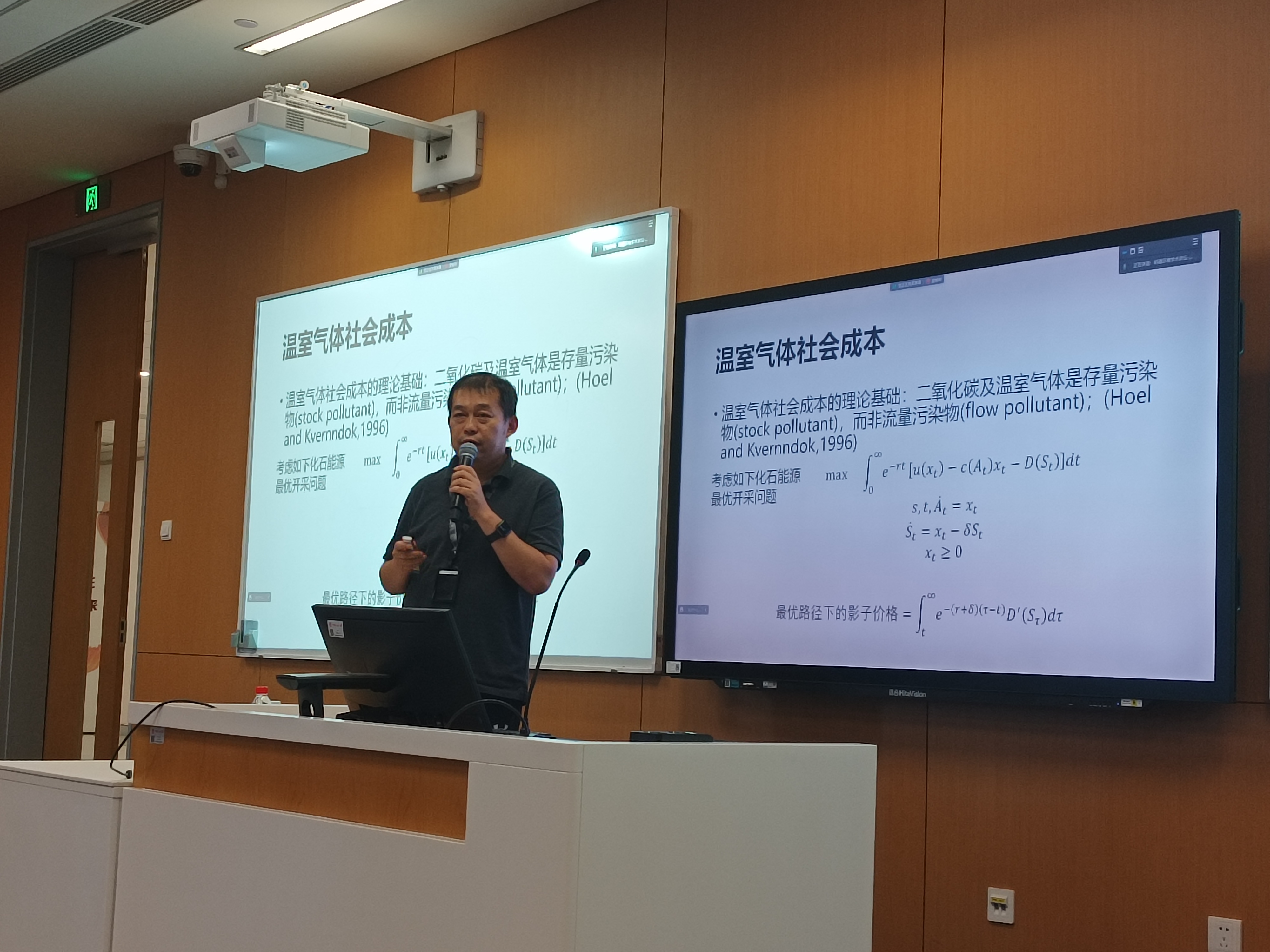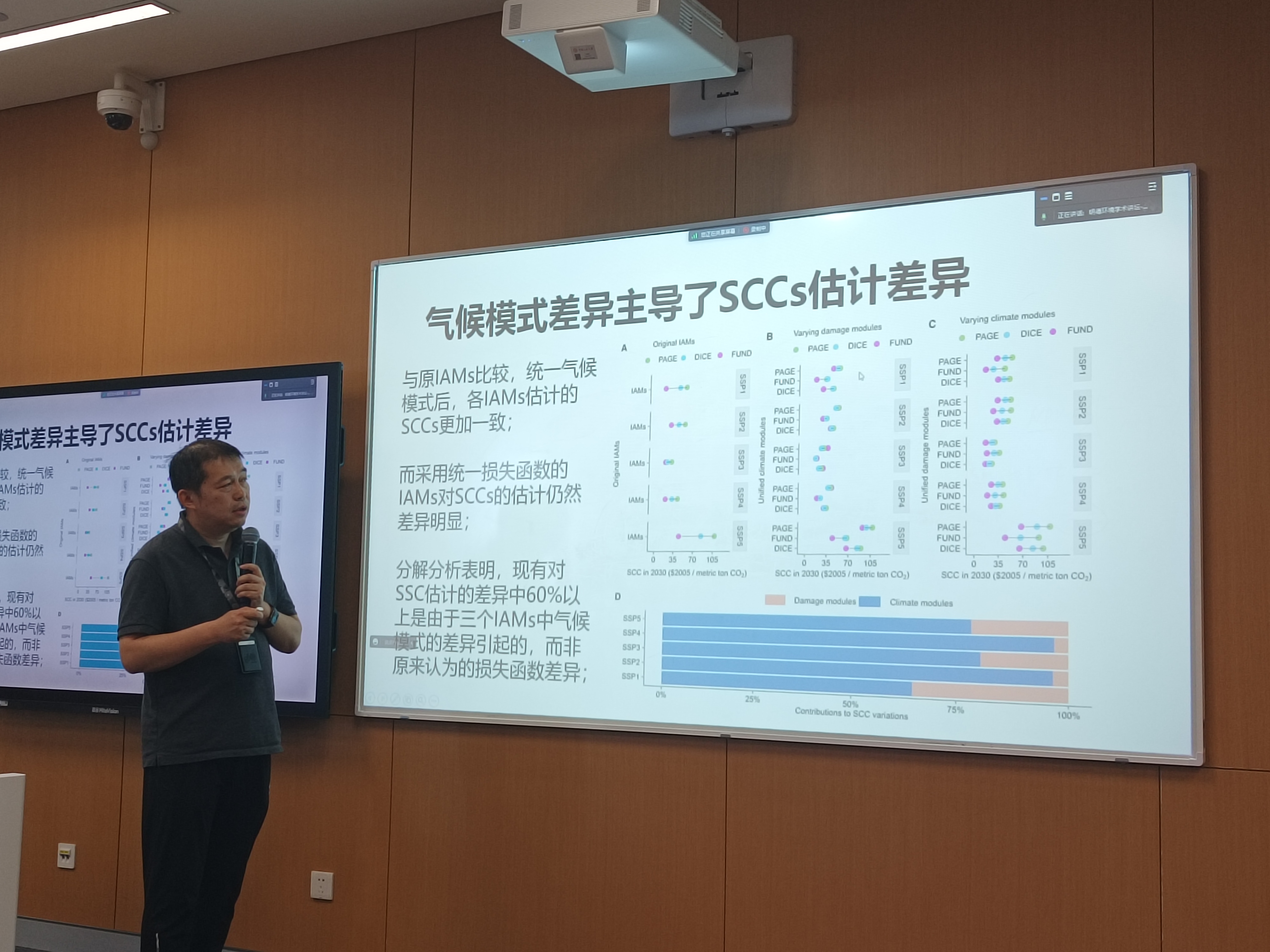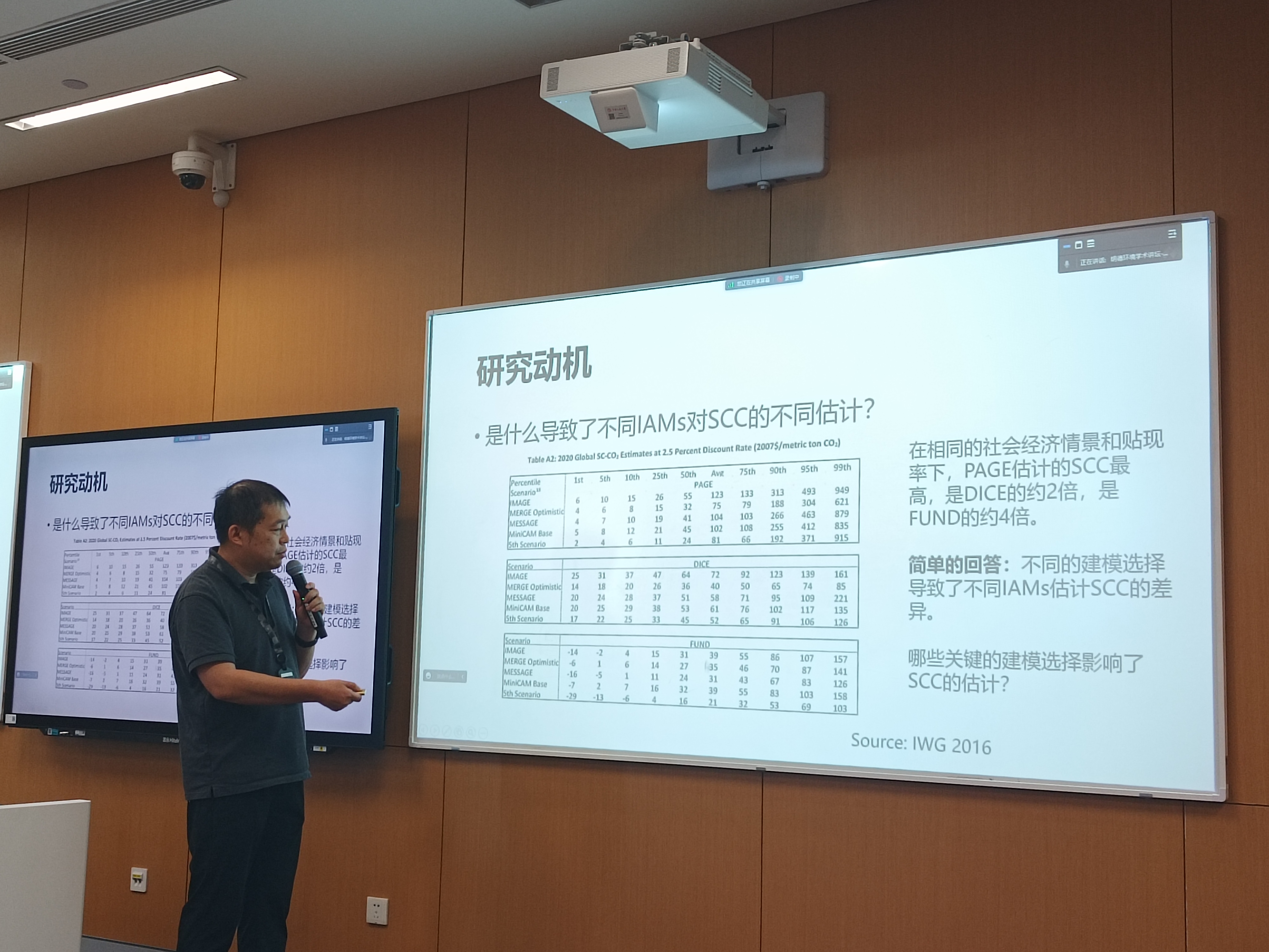 首先,滕飞教授对温室气体社会成本的理论与政策背景进行了梳理,他指出由于二氧化碳及温室气体是存量污染物而非流量污染物,其在大气中的长期累积作用会产生温升效应,进而对社会经济造成损害。当前,碳社会成本的核算结果被广泛应用于法规与政策的制定和项目的成本效益分析中。然而,由于核算碳社会成本的综合评估模型(IAMs)存在参数和模型具有不确定性、缺乏透明度和只关注气候变化的中心趋势等问题,部分学者对基于IAMs计算得出的碳社会成本的有效性提出了质疑。此外,机构间工作组(IWG)分别使用FUND、DICE以及PAGE等模型对碳社会成本进行核算,发现即使在相同的社会经济情景和贴现率下,评估结果也存在很大差异。