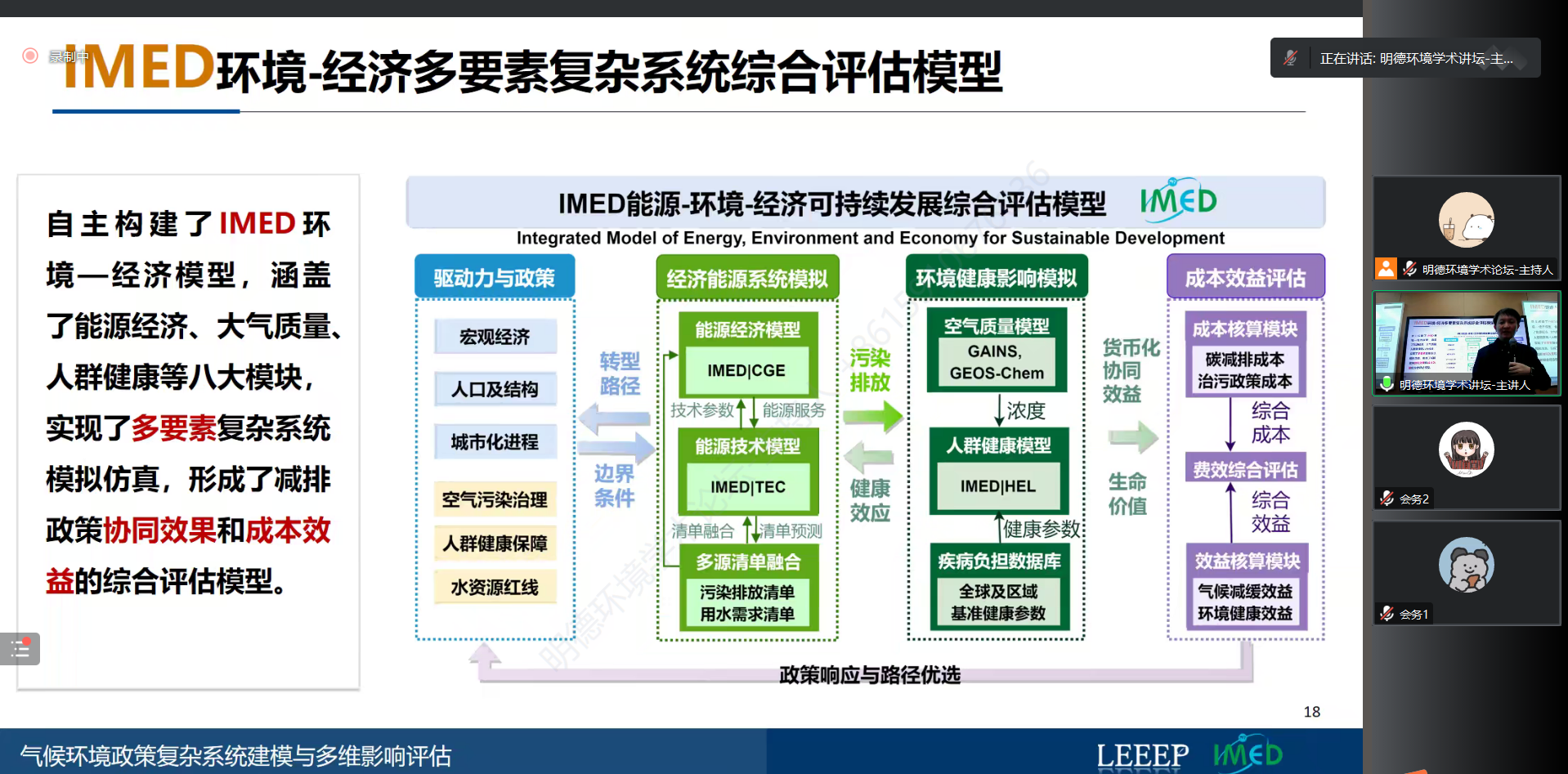 戴瀚程研究员指出,IMED模型触及多学科知识融合与数值模拟,贯穿了理论-数据-建模-仿真的全过程,可与全球和省级清单耦合,并适用于四大结构调整分析。IMED能源-环境-经济模型作为我国兼顾减污降碳政策评估的代表性模型之一,提升了对减排政策协同效果的评估质量。钢铁行业碳中和路径、水泥行业碳中和路径、碳排放-水资源耦合研究等案例,则将IMED-CGE、TEC模型进行了综合运用,反映出IMED模型在分析减污降碳协同机制持续进化中的作用。