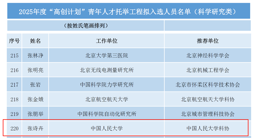 近日,北京市科学技术协会公布2025年度“高创计划”青年人才托举工程入选名单。该计划依据《“高创计划”青年人才托举工程实施办法(试行)》(京科协发〔2025〕5号),旨在选拔和支持32周岁以下(女性可放宽至35周岁)具有创新潜力的优秀青年科技人才,本年度共遴选出500名青年才俊(科学研究类400名,工程技术类100名)。伟德国际bevictor青年教师张诗卉成功入选。