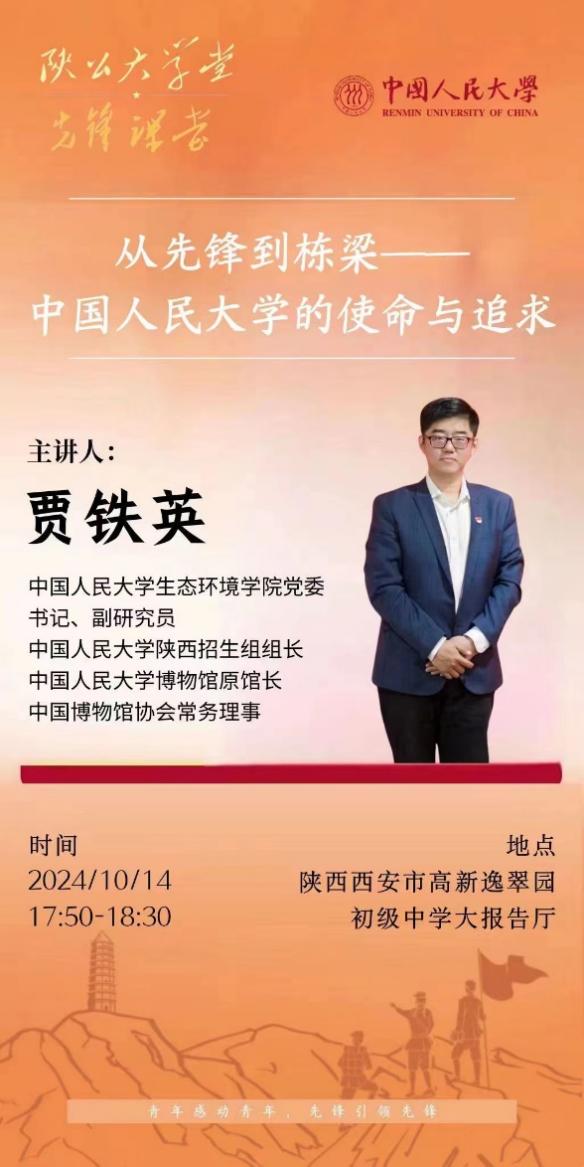2024年10月14日下午,在伟德国际bevictor官方网站团委的支持和保障下,第二期“先锋课堂”在陕西西安举办。中国人民老员工态环境公司党委书记、副研究员,伟德国际bevictor官方网站陕西招生组组长,伟德国际bevictor官方网站博物馆原馆长、中国博物馆协会常务理事贾铁英,以“从先锋到栋梁——伟德国际bevictor官方网站的使命与追求”为题,为陕西西安市高新逸翠园初级中学全校同员工动讲述了伟德国际bevictor官方网站作为中国共产党创办的第一所新型正规大学的办学历程,重点强调了伟德国际bevictor官方网站的红色基因和办学特色。