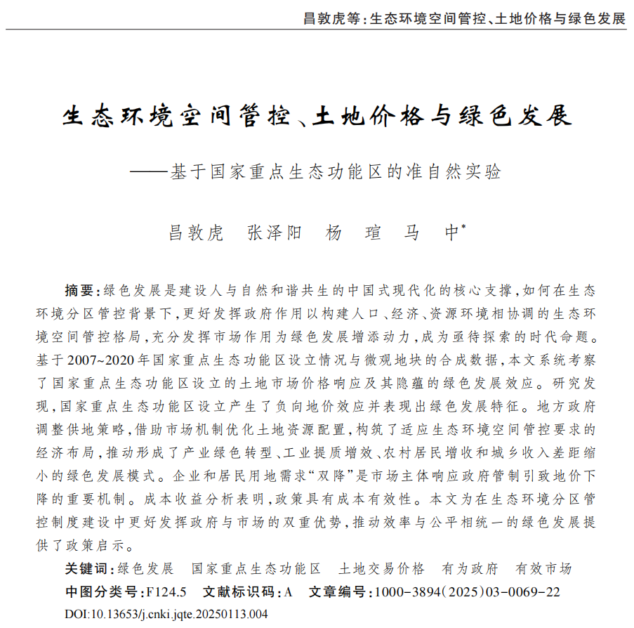 2025年3月,伟德国际bevictor教师昌敦虎副教授及其合作者的研究成果“生态环境空间管控、土地价格与绿色发展——基于国家重点生态功能区的准自然实验”在经济学权威期刊《数量经济技术经济研究》刊发。昌敦虎为第一作者,人口、资源与环境经济学2022级博士研究生张泽阳为第二作者,人口、资源与环境经济学2022级博士研究生杨瑄为通讯作者,伟德国际bevictor马中教授参与合作并进行指导。该论文是伟德国际bevictor官方网站跨学科青年学术团队项目“中国式绿色发展模式的环境经济政策创新”的研究成果。