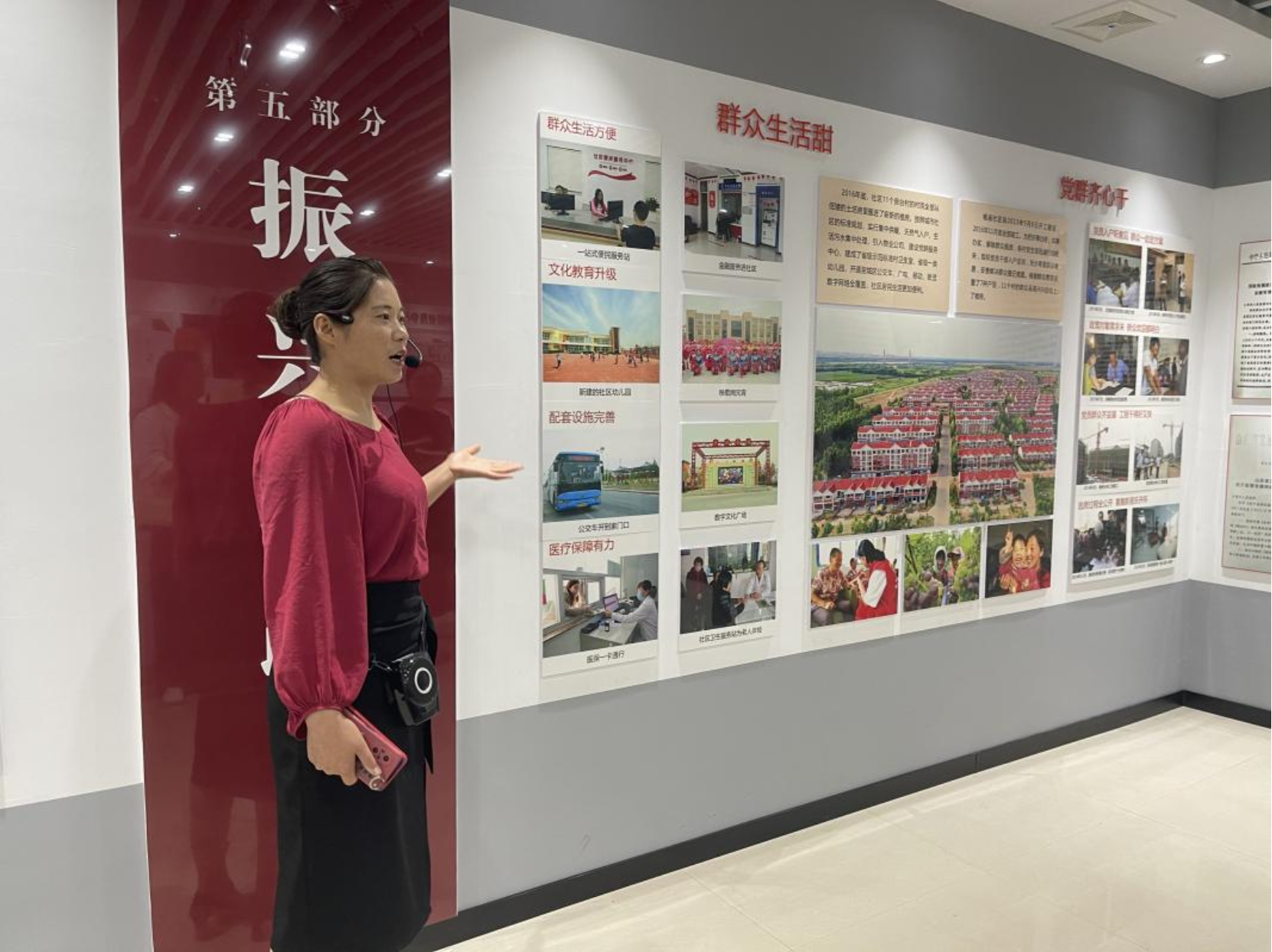 首先,课题组成员阅览了黄河南展区历史文化展厅。“黄河滩区居民迁建工程概况”展板显示,黄河流入东营后形成的窄河道曾多次决口,给滩区人民造成巨大伤害。为了保障群众生活空间,1971年黄河南展工程开始建设,但蓄洪区政策限制导致南展区基础设较为薄弱。长期以来,党中央高度重视黄河下游滩区治理和滩区群众脱贫致富,取消了南展区蓄滞洪区功能,防台村搬迁改造于2013年开启。新型农村社区建设开始启动,垦利区董集镇杨庙社区便是其中之一。在迁建历程中,各大队支部在党的领导下发挥领头雁作用勇担当、做表率,广大群众舍小家、顾大家,昔日黄河滩里的“穷窝窝”蝶变成幸福家园。黄河滩区的迁建历史给课题组成员上了一堂生动的党课,成员们深刻领悟到听党话、跟党走,识大体、顾大局的担当奋进精神。