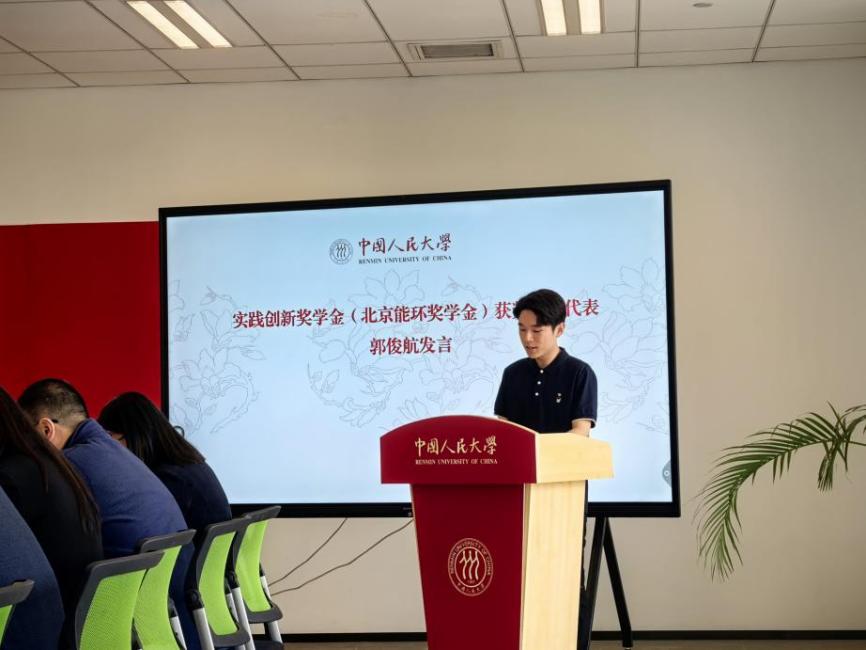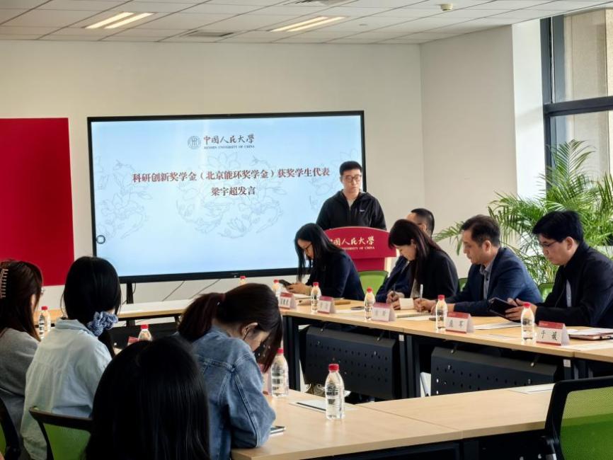 2022级博士研究生梁宇超代表科研创新奖学金获得者发言。他表达了对北京能环科技发展中心和公司的诚挚谢意,并结合自身科研经历,分享了能源与环境研究的心得体会,强调科研工作需要扎根理论、直面现实挑战,同时以“愚公移山”的毅力和“滴水穿石”的定力深耕专业领域。他表示,未来将继续以师长为榜样,为构建人与自然和谐共生的现代化贡献力量。