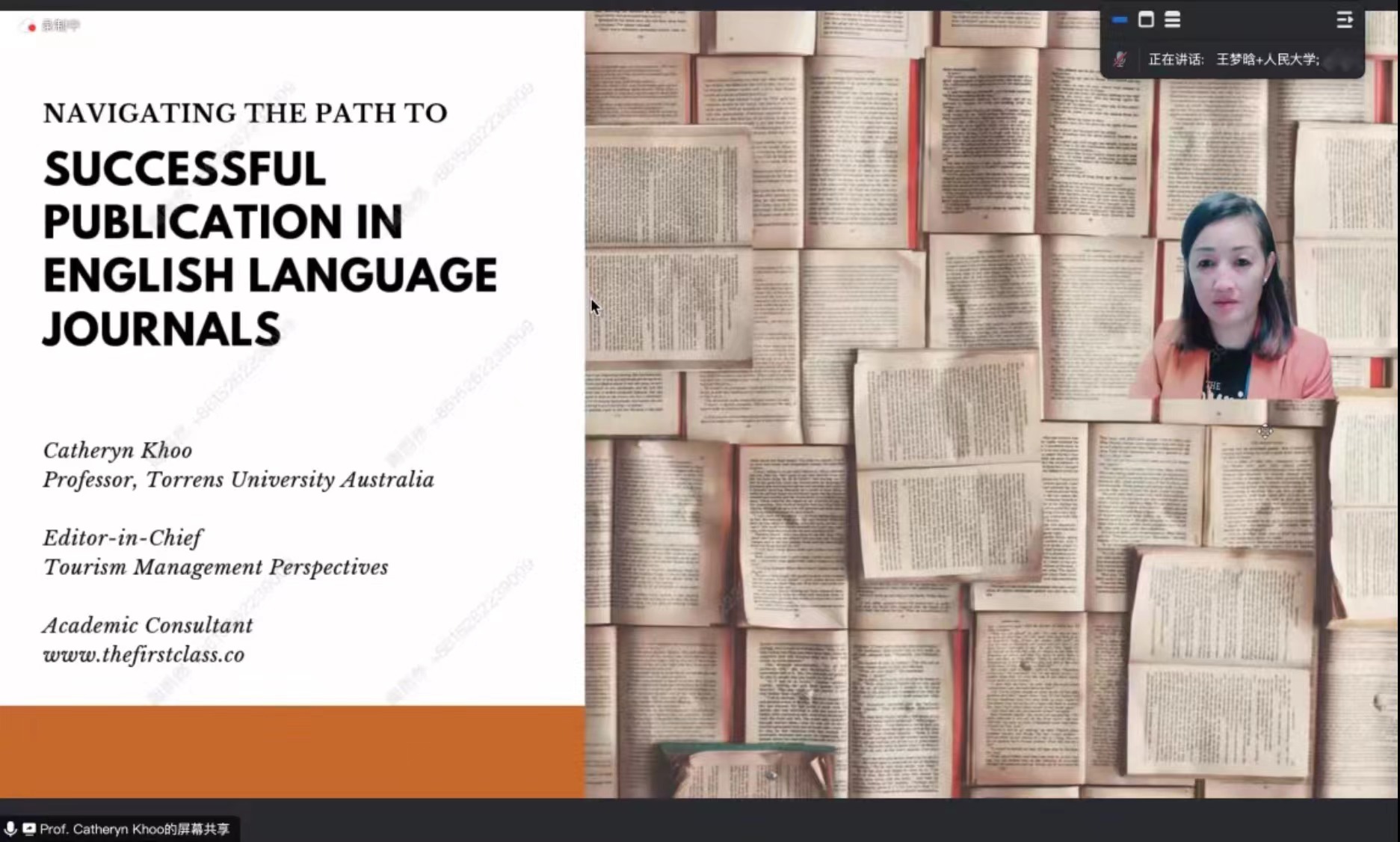 2023年10月30日上午,伟德国际bevictor官方网站环境公司主办的明德环境国际学术前沿讲座以线上线下结合的方式成功举办。本次讲座邀请SSCI一区期刊Tourism Management Perspective主编澳大利亚Torrens大学Catheryn Khoo教授为环境公司师生及其他高校的线上参会者就“国际期刊论文发表的成功路径”进行了分享。会议由伟德国际bevictor官方网站环境公司苏明明副教授主持。