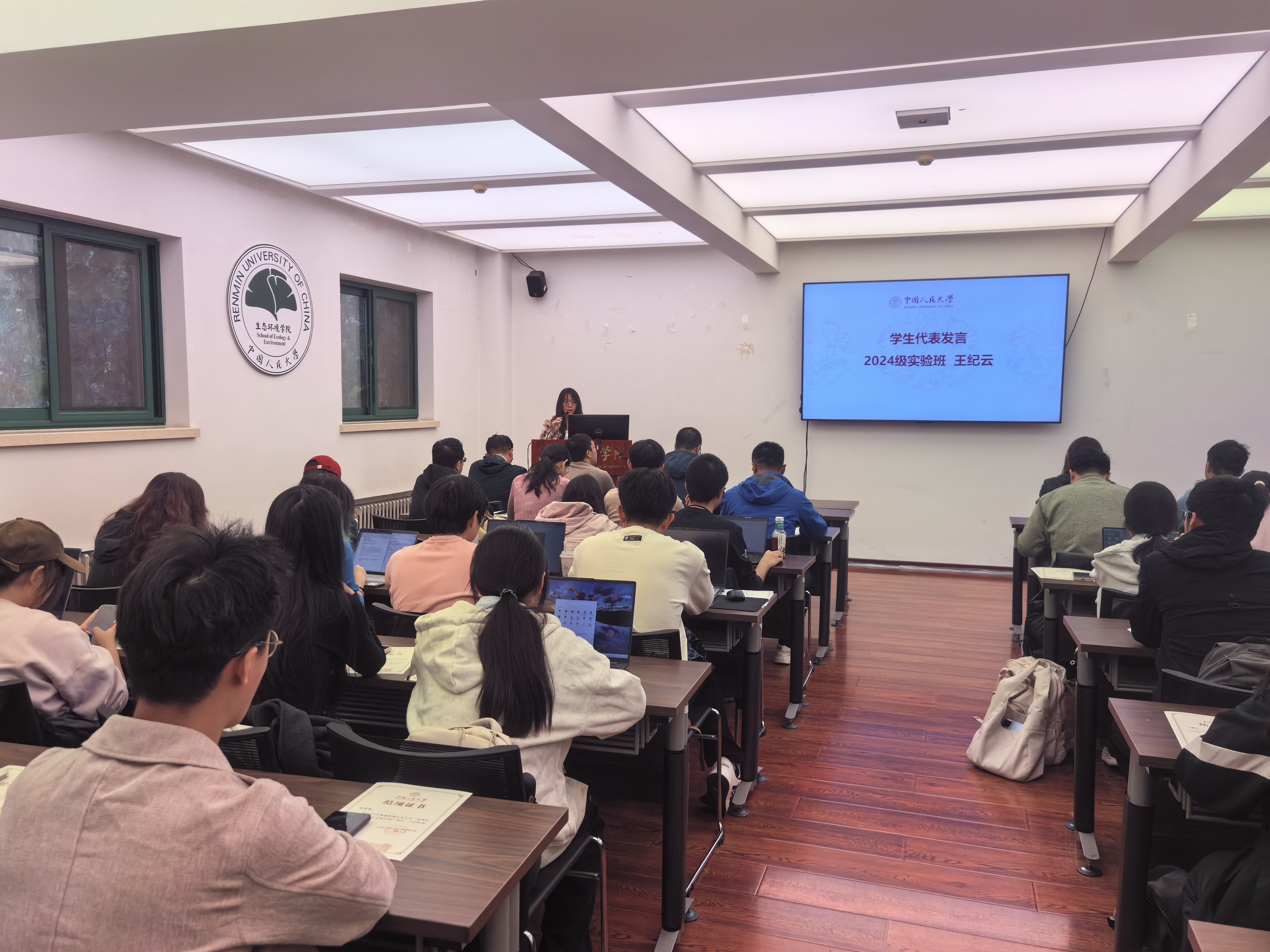 获奖员工代表、2024级明德环境“经济学-科学”实验班王纪云分享调研见闻与心得。她从“出发”的缘起讲起,提及课堂中对鄂尔多斯“资源型城市”的固有认知,以及参与调研后探寻其在“双碳”目标下发展路径的迫切期待。在“行走”的见闻中,她重点介绍鄂尔多斯的绿色蜕变:巴日图塔村的天骄绿能50万千瓦光伏项目,让4.2万亩采煤沉陷区变成蓝色光伏“海洋”;当地以绿色制砖技术将煤矸石“废料”转化为“金砖”;零碳产业园与风光储一体化项目成为转型核心引擎,让“新质生产力本身就是绿色生产力”的理念落地生根。此外,昌茂绿怡生态农场的绿色种植、敏盖绒山羊繁育中心的现代化养殖,也让她深刻理解“绿色发展是高质量发展的底色”,并承诺将以青年之力成为绿色理念传播者、生态创新探索者与可持续发展践行者。