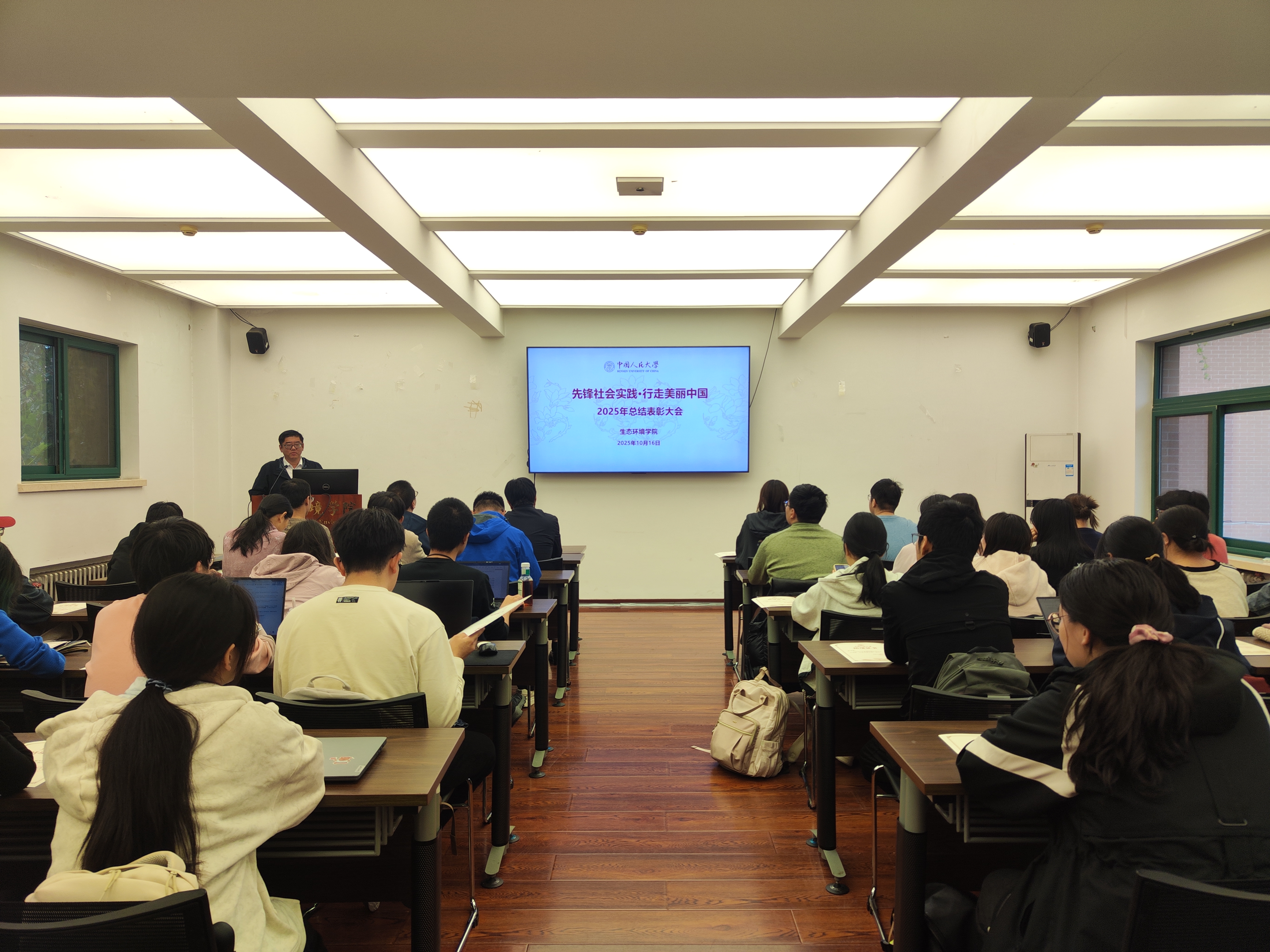 庞军发表讲话,他指出,2025年“先锋社会实践·行走美丽中国”暑期社会调研项目是公司落实“立德树人”根本任务、深化“产学研用”融合育人的关键举措。调研期间,5支实践团、89名师生带着对生态文明建设的思考,跨越东北林海、闽北茶山、内蒙古草原、四川峨眉、浙江海岸,用一周左右时间完成了覆盖万余里的“生态研学之旅”。团队紧扣党的二十大“完善生态保护补偿制度”“发展海洋经济” 等部署,聚焦国家公园建设、生态产品价值实现、能源绿色转型、海洋污染治理核心议题,在专业教师全程指导下制定并执行调研方案,以务实行动彰显“人大人”的责任与担当。他对员工提出四点期待,一是保持“扎根一线”的调研自觉,让专业判断始终立足现实土壤;二是锤炼“解决问题”的专业能力,将理论知识转化为破解生态难题的工具;三是担当“传播理念”的社会责任,通过多元形式分享生态成果与治理难题,让“绿水青山就是金山银山”理念深入人心;四是树立“长期奋斗”的远大志向,在生态保护“持久战”中找准专业方向与国家需求的结合点,实现人生价值。