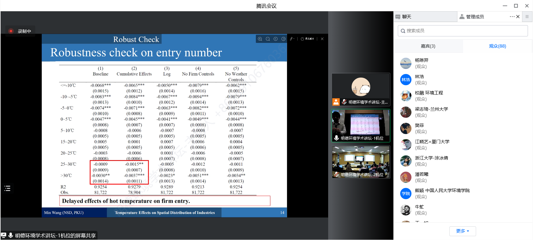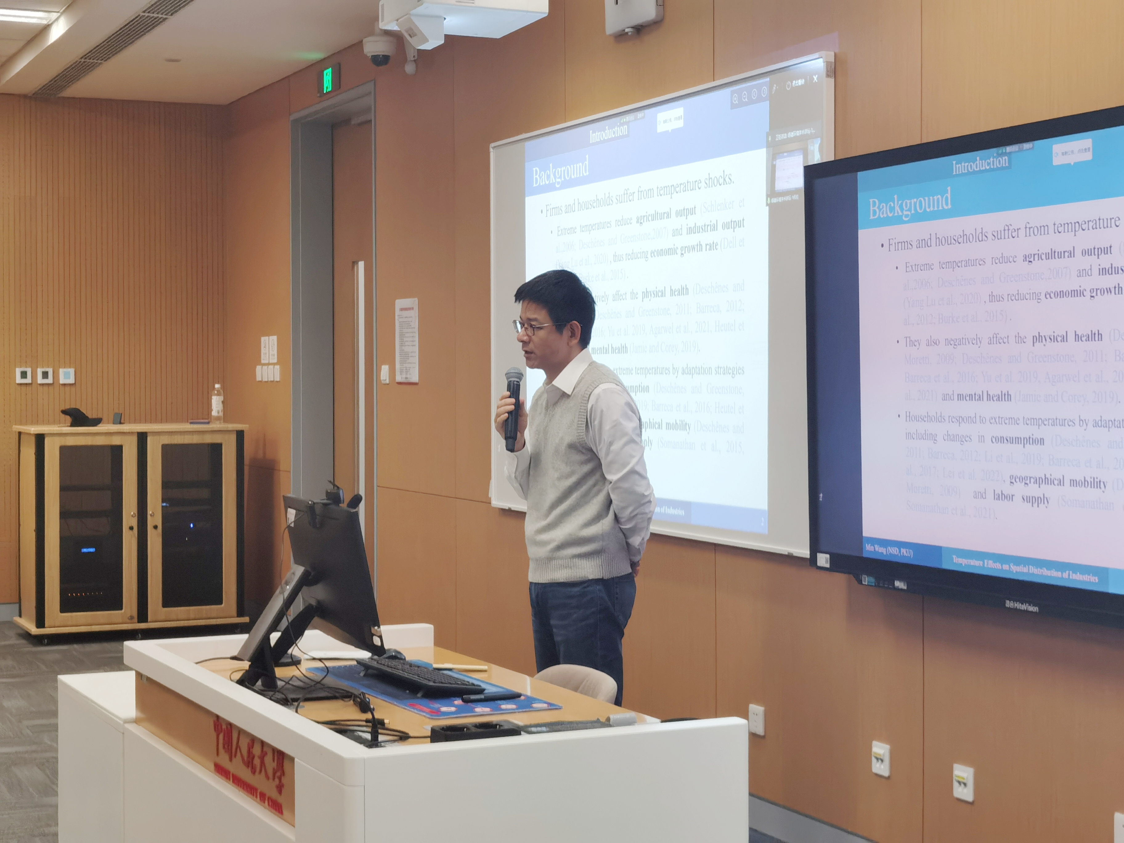 2022年11月5日,伟德国际bevictor官方网站环境公司主办的“明德环境学术讲坛”第十讲以线上线下结合的方式成功举办。本次讲坛邀请北京大学国家发展研究院王敏副教授作了题为“Temperature Effects on the Spatial Distribution of Industries”的学术报告。伟德国际bevictor官方网站环境公司经理庞军教授首先致辞,代表公司对王敏副教授为公司师生作学术报告表示诚挚感谢。会议由伟德国际bevictor官方网站环境公司昌敦虎副教授主持。