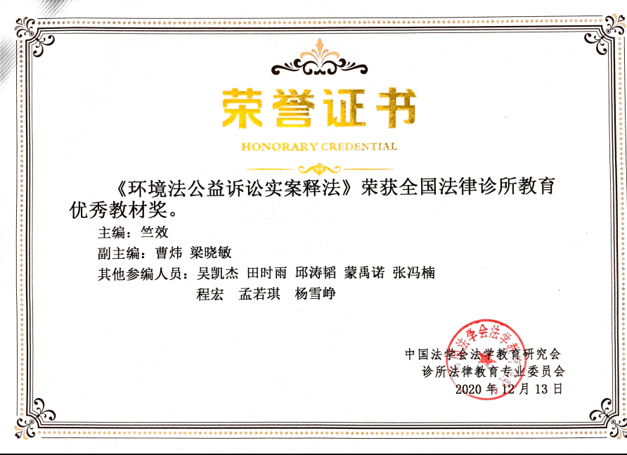 环境法实案释法系列案例教材还曾多次应用于审判人员和环保公益培训。该系列教材所提应用对策也曾被有关法院审理疑难案件所借鉴。2018年,该系列教材中首部出版的《环境公益诉讼实案释法》专册还曾获得“全国法律诊所教育优秀教材奖”。