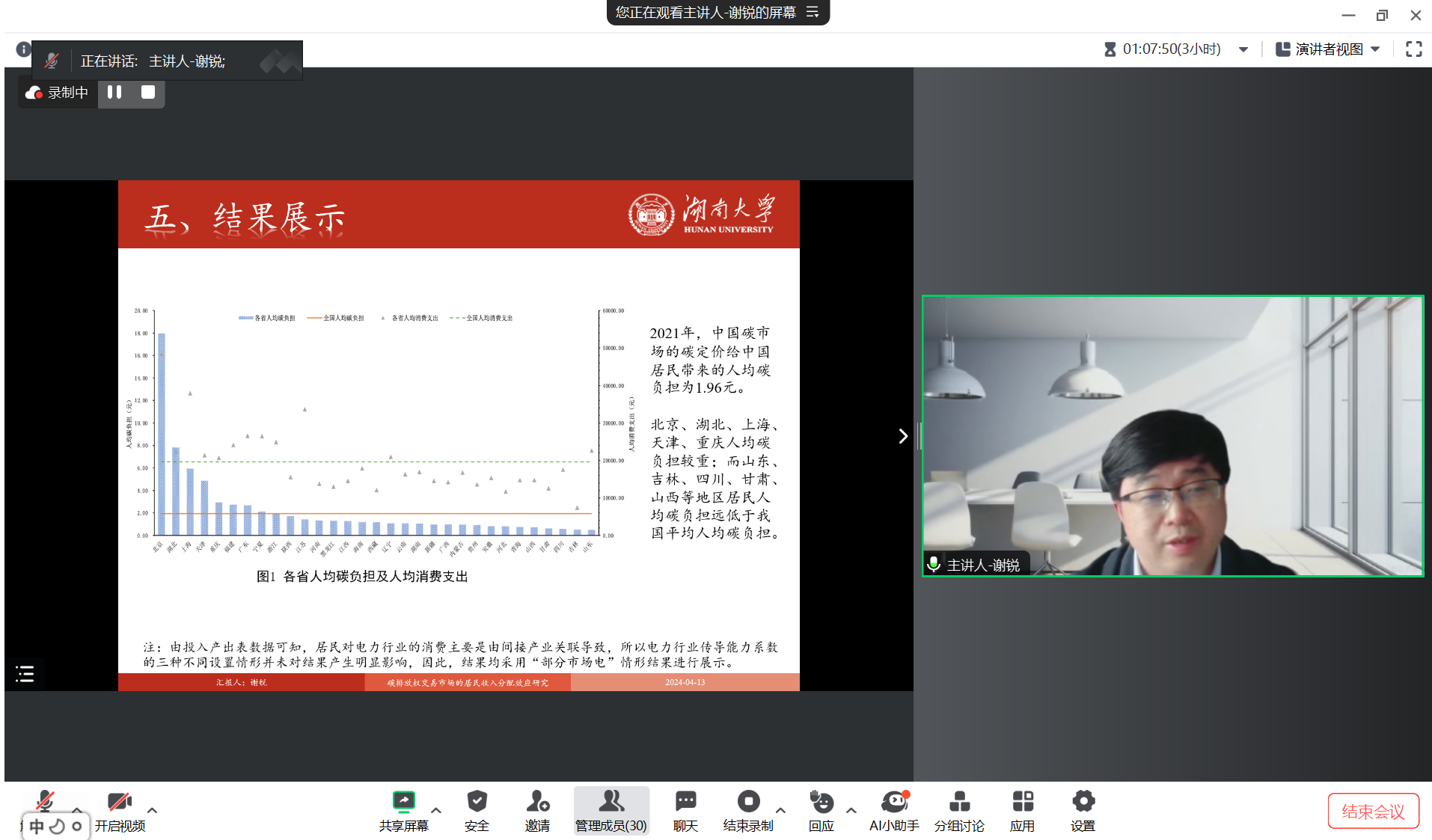 接下来,结合中国碳市场的发展历程和主要特征,谢锐教授对具体模型的构建和所用数据的来源进行了介绍。在构建多区域投入产出模型的基础上,谢锐教授的研究团队引入成本传导能力指标,推导出部分传导情况下的投入产出价格模型,并采用扩展线性支出系统(ELES)模型测算消费者需求价格弹性,最终构建出能够准确测算碳定价冲击造成的居民碳负担的投入产出模型。