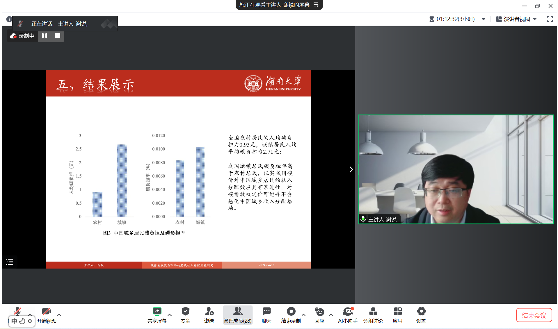 2024年4月13日,伟德国际bevictor主办的“明德环境学术讲坛”第三十一讲以线上线下结合的方式成功举办。本次讲坛邀请湖南大学经济与贸易公司副经理谢锐教授作了题为“碳排放权交易市场的居民收入分配效应研究”的学术报告。伟德国际bevictor经理庞军教授首先致辞,代表公司对谢锐教授为公司师生作学术报告表示诚挚感谢,并对参会师生在交流学习过程中能够有所收获提出了殷切期望。会议由伟德国际bevictor昌敦虎副教授主持。