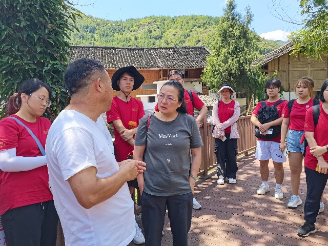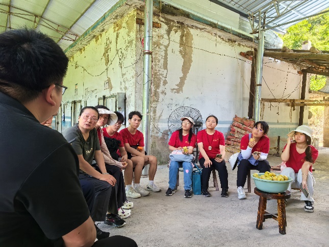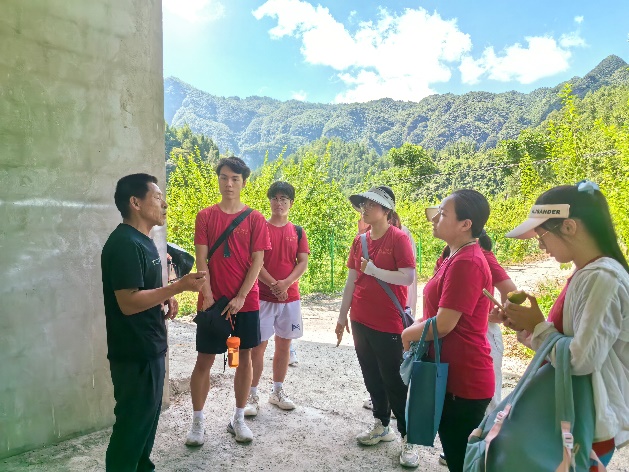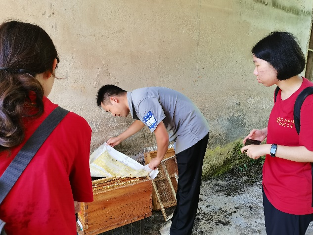当地工作人员向调研团师生介绍峰坝村特色农产品种植和中蜂养殖情况